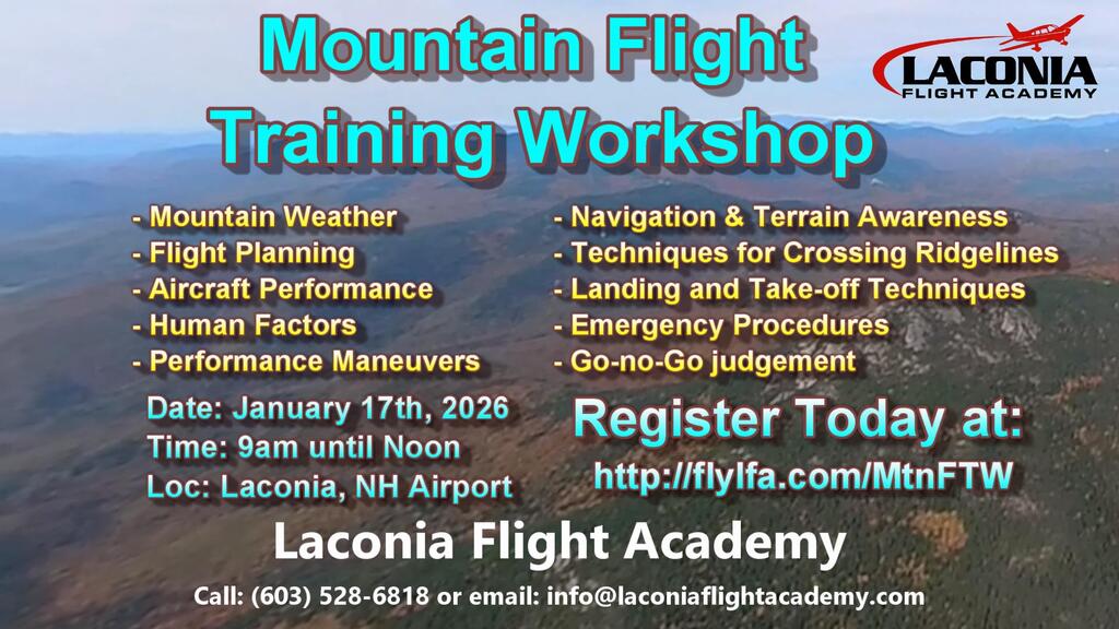 Laconia Flight Academy will be conducting a Mountain Flight Training Workshop on Saturday morning, January 17th, 2026. The 3-hour workshop will run from 9am until Noon and will be hosted at the Laconia Airport terminal. We will also be live-streaming the workshop for those who want to attend remotely.